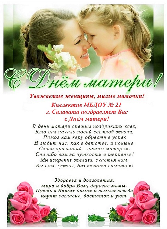 Администрация и педагогический коллектив МБДОУ №21 г.Салавата от всей души поздравляет милых мам с праздником!