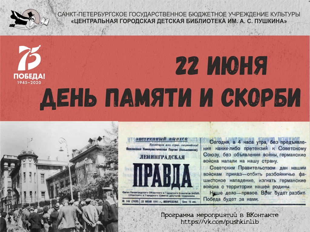 День памяти и скорби 22 июня 2020 года — это 79-я годовщина начала Великой Отечественной войны. Именно в этот день летом 1941 года началась самая кровопролитная и страшная война в истории нашей страны, явившаяся основной частью Второй мировой войны 1939-1945 годов. В 2020 году ЦГДБ им. А.С. Пушкина подготовила специальную программу онлайн-мероприятий, которые проходят на всех интернет-ресурсах библиотеки, а также представлены на портале http://pro.culture.ru