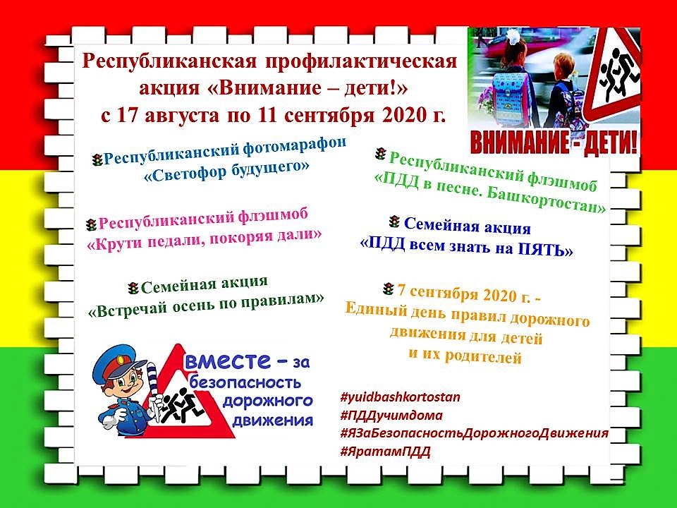 • Республиканский фотомарафон «Светофор будущего»: выкладывать в социальных сетях фотографии, рисунки, видео на тему «Светофор будущего!» с официальными хэштегами #yuidbashkortostan #СветофорБудущего